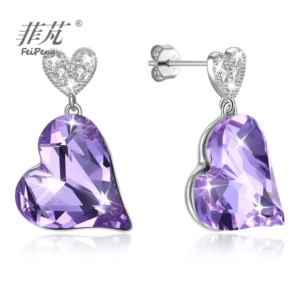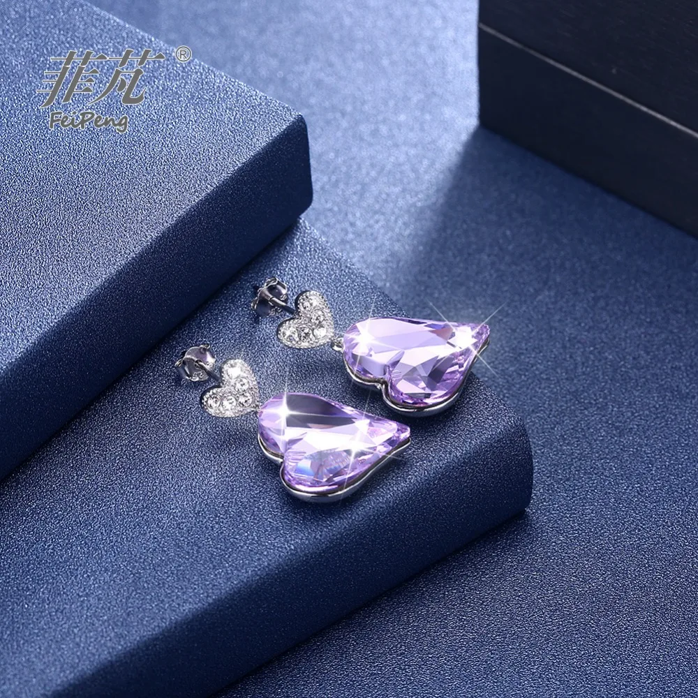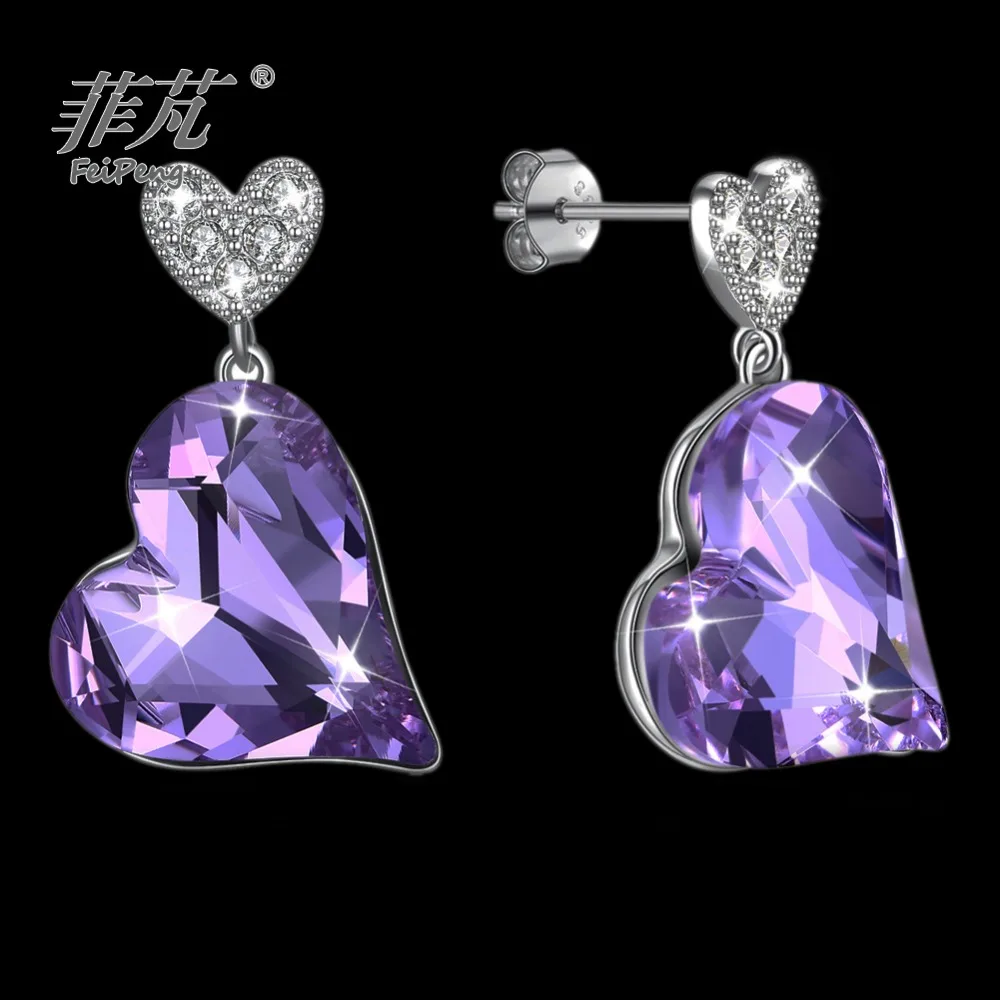 REVIEW TOP SELLER Violet heart crystal stone Hanging piece jewelry 925 silver white gold plating stud earring jewelle